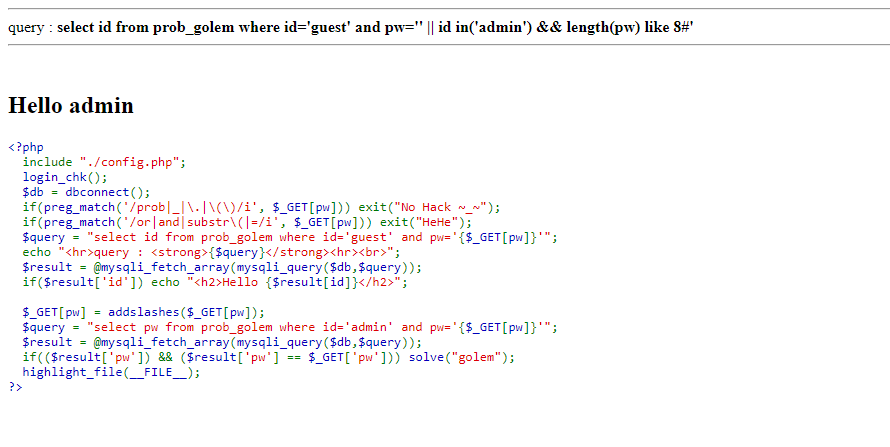 만약 둘 다 성립하여 Hello admin라는 글이 페이지에 표시된다는 것은, 대입한 j 값이 올바른 값이었던 것이다.